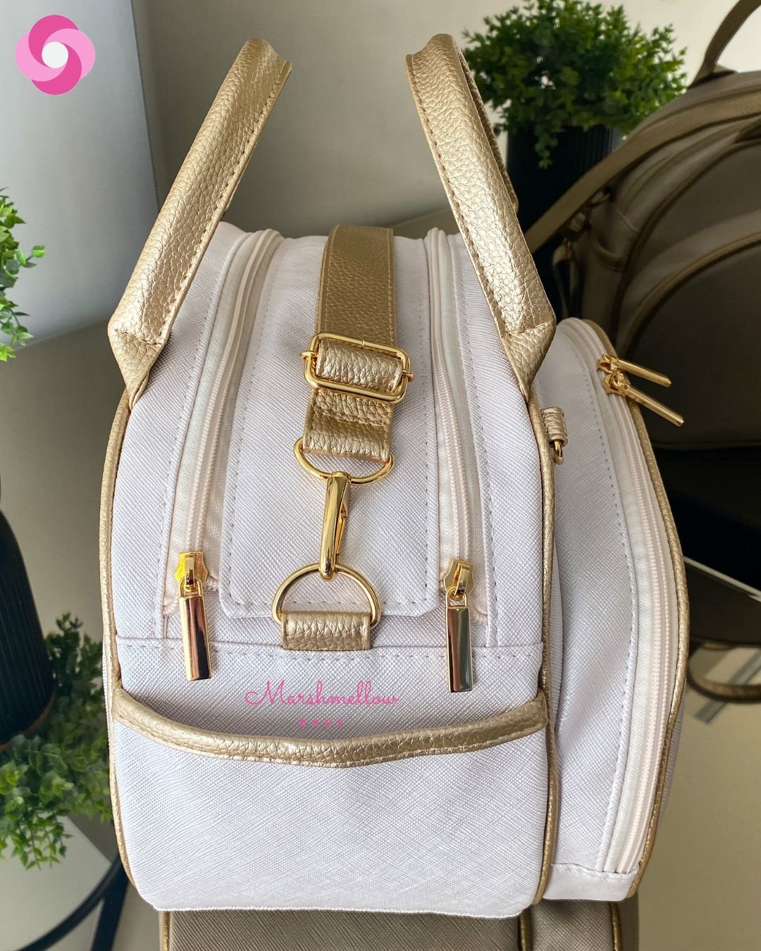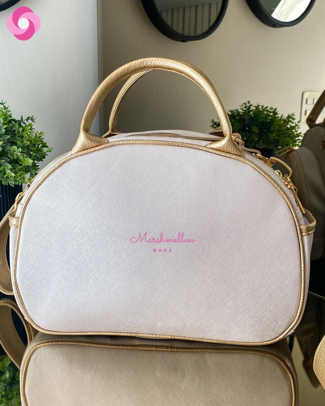 Bolsa Clássica M – Sintético pérola perolizado + detalhes em sintético dourado