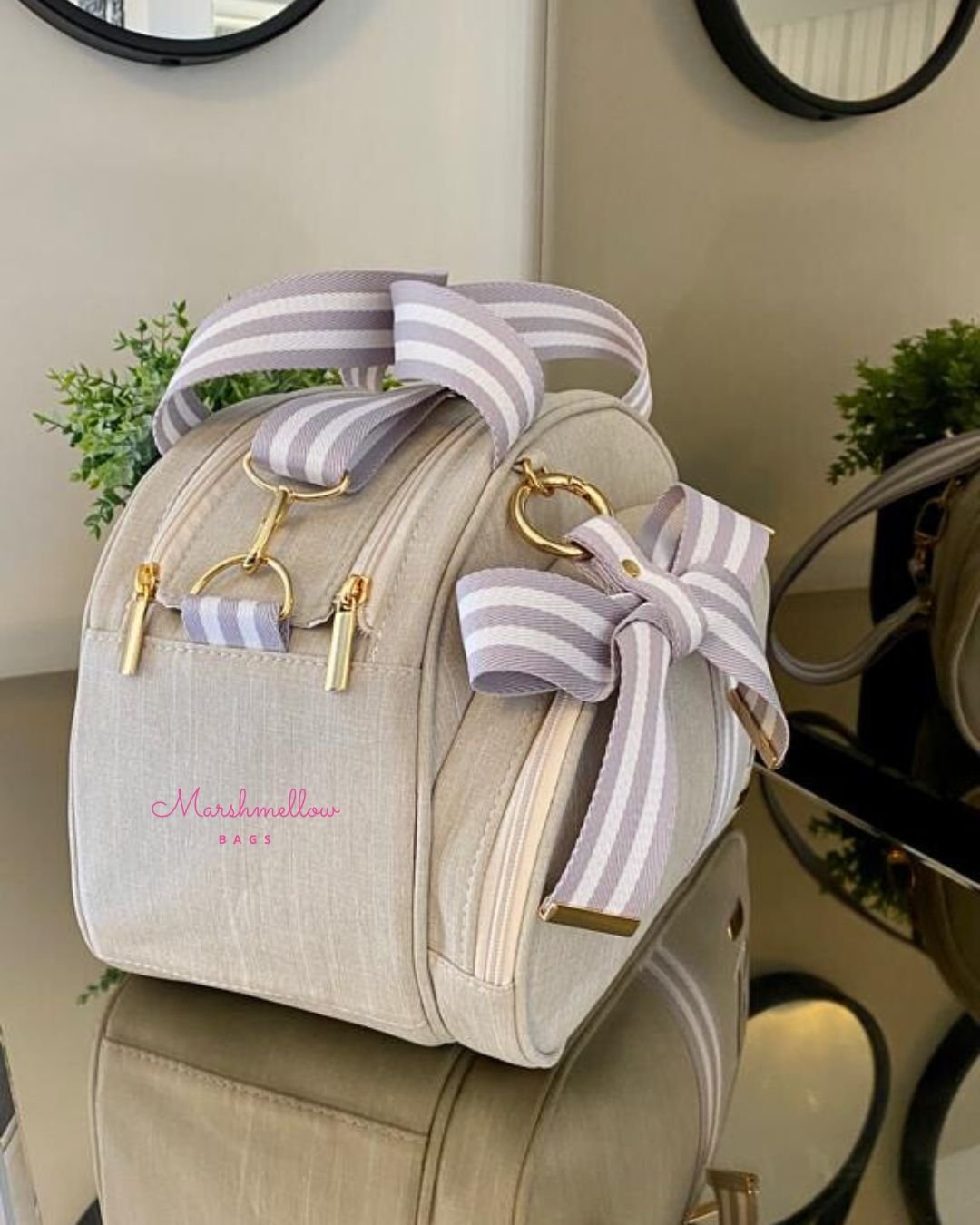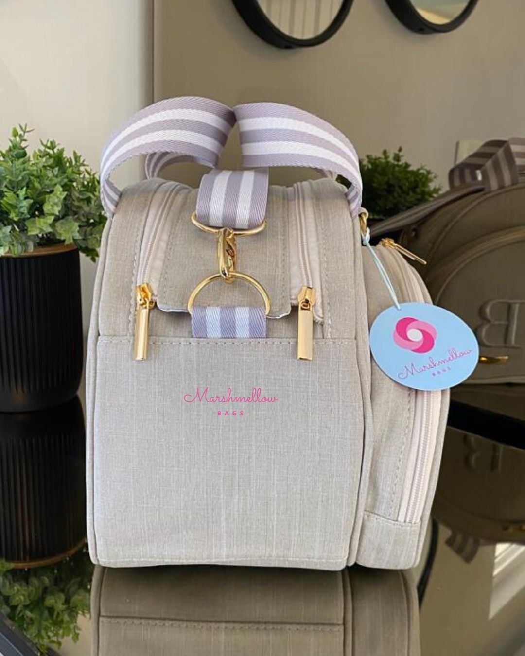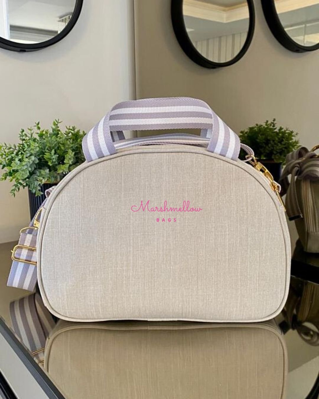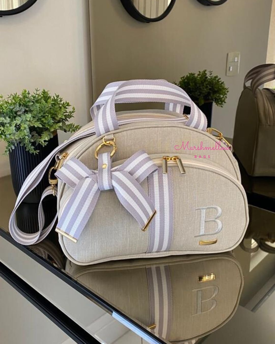 Bolsa Clássica M – Linho bege cru + fitas cinza com branco e bordado cinza