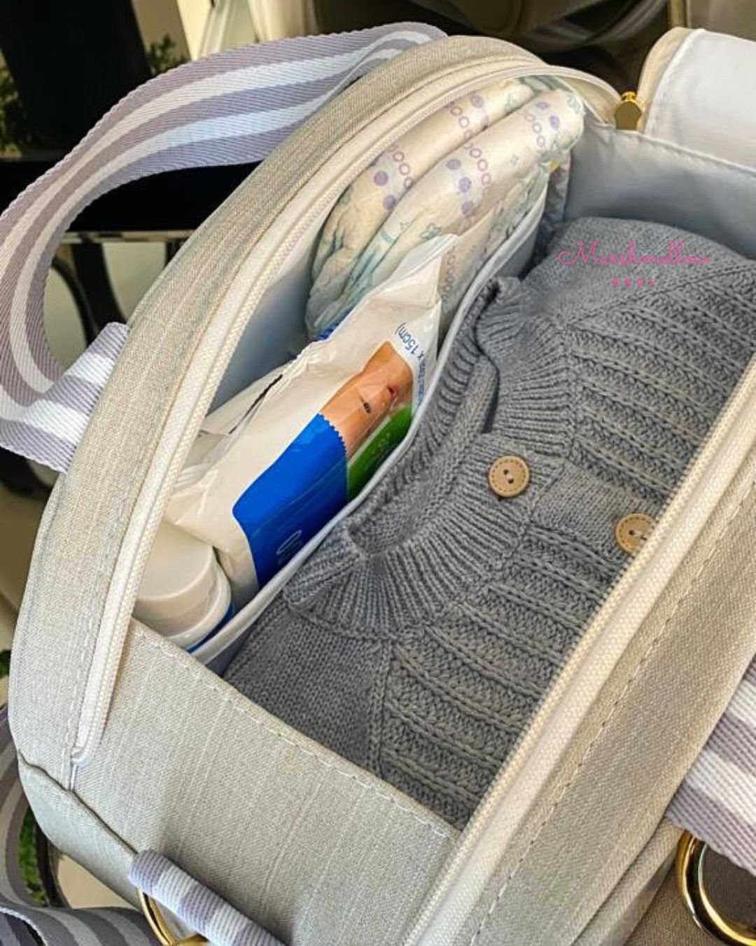 Contém um bolso frontal de fechamento em zíper, com dois elásticos para mamadeiras, copinhos, etc, e um bolso de plástico translúcido para separar outros itens. O compartimento principal tem um bolso plástico de zíper e um bolso também de plástico translúcido. A bolsa conta com abertura dupla de zíper, sendo assim, você tem uma grande visibilidade dos itens que estão dentro da bolsa!