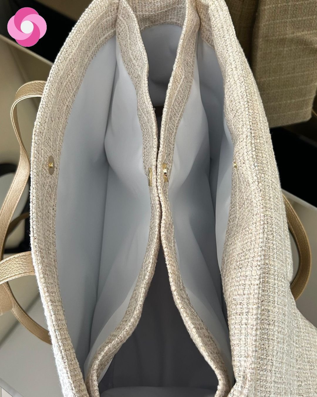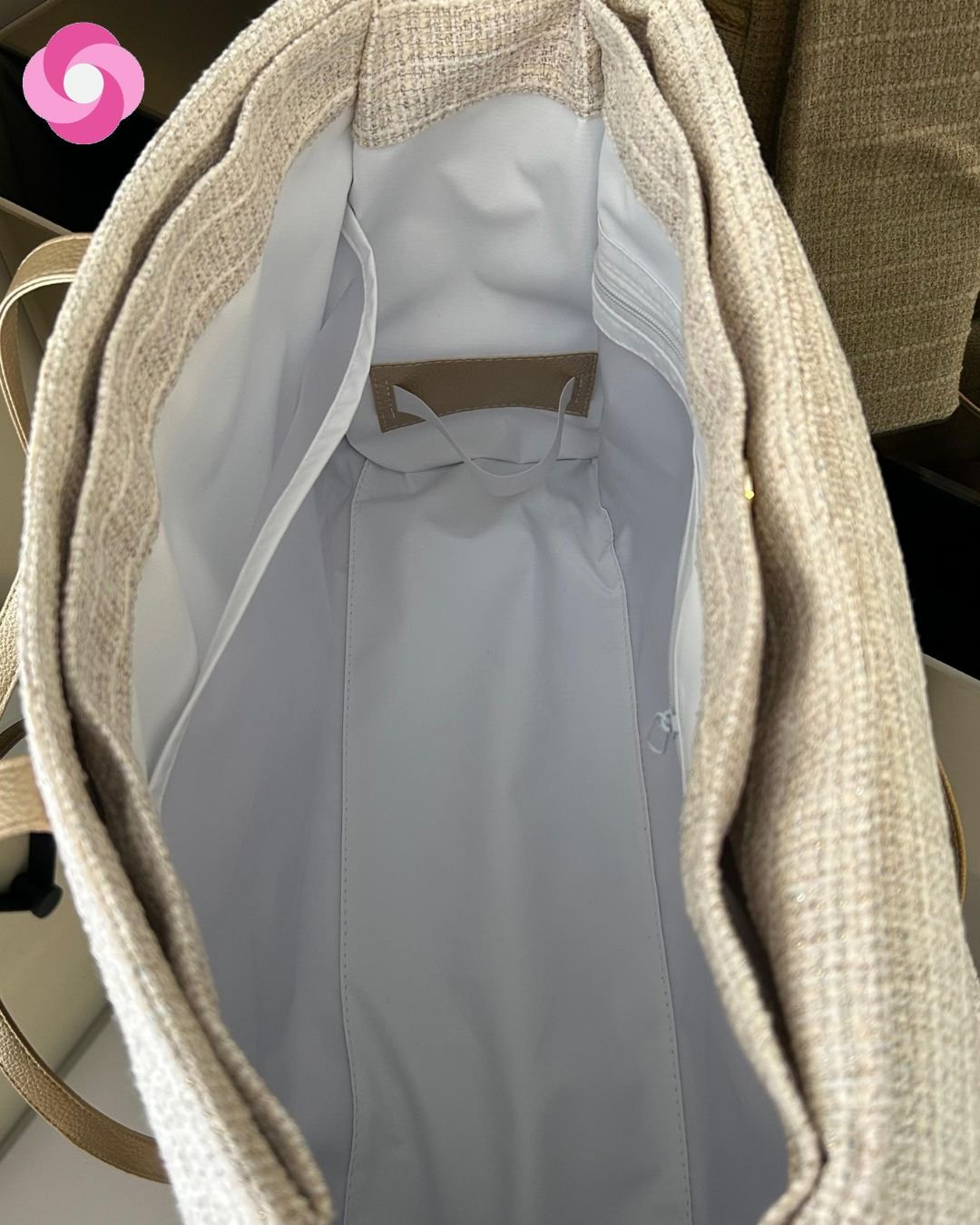 No interior ela tem 3 divisórias, sendo uma principal, com 2 elásticos porta mamadeiras e outras duas separadoras com fechamento em botão de imã! Ela é uma bolsa para passeios super longos e será uma super auxiliar para a ida à maternidade!