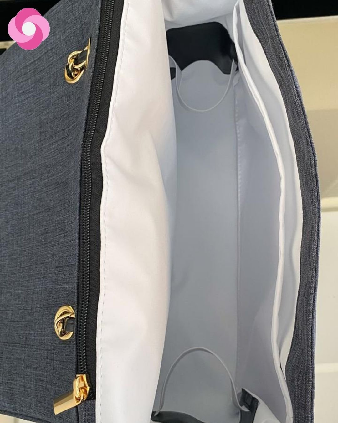 No interior ela tem dois bolsos, sendo um com zíper e outro sem, dois elásticos para mamadeiras, copinhos e um bolso traseiro para acomodar o trocador portátil!