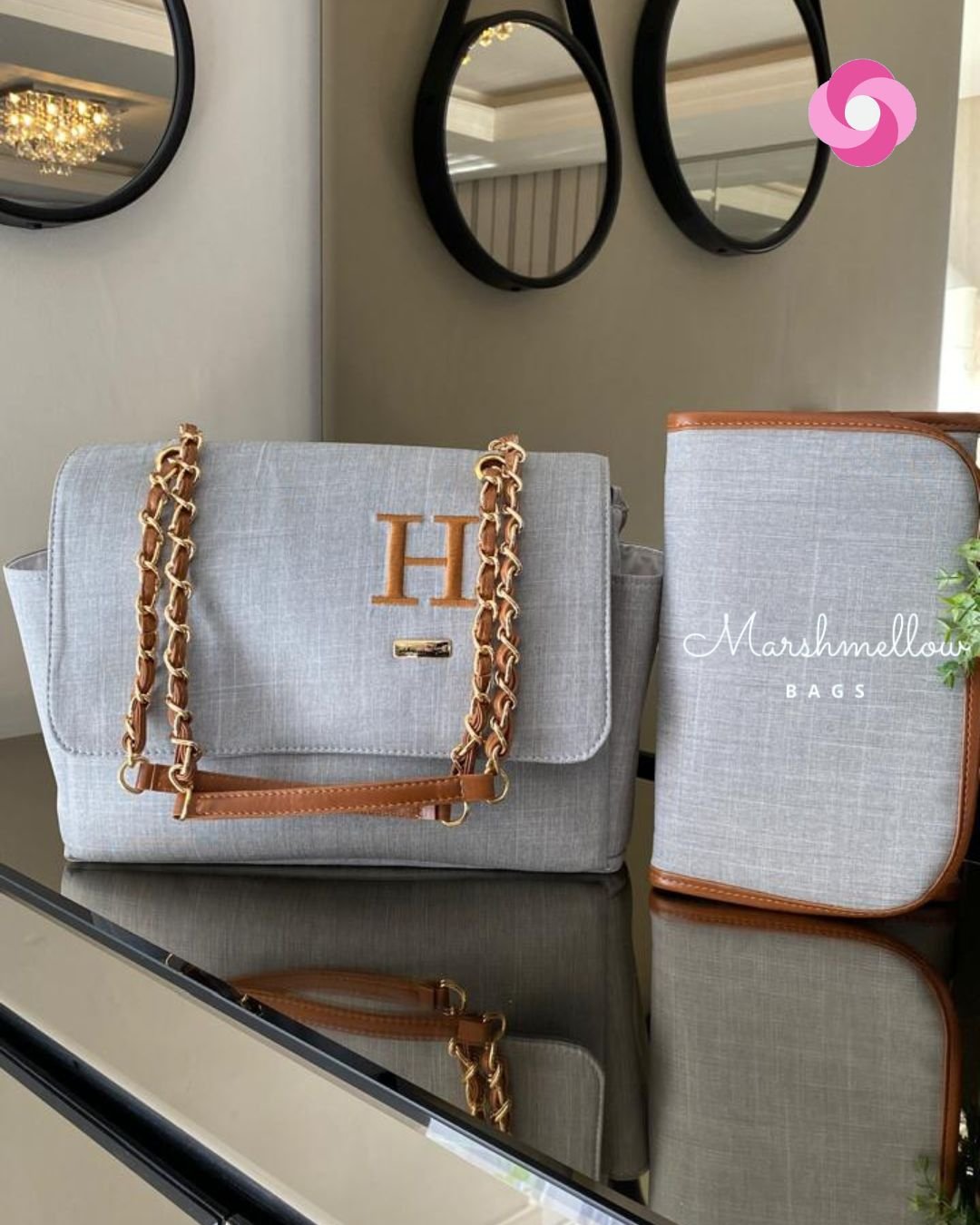 Bolsa Vegas – Linho Original na cor Cinza Mescla com detalhes Caramelo, Luxo e elegância!