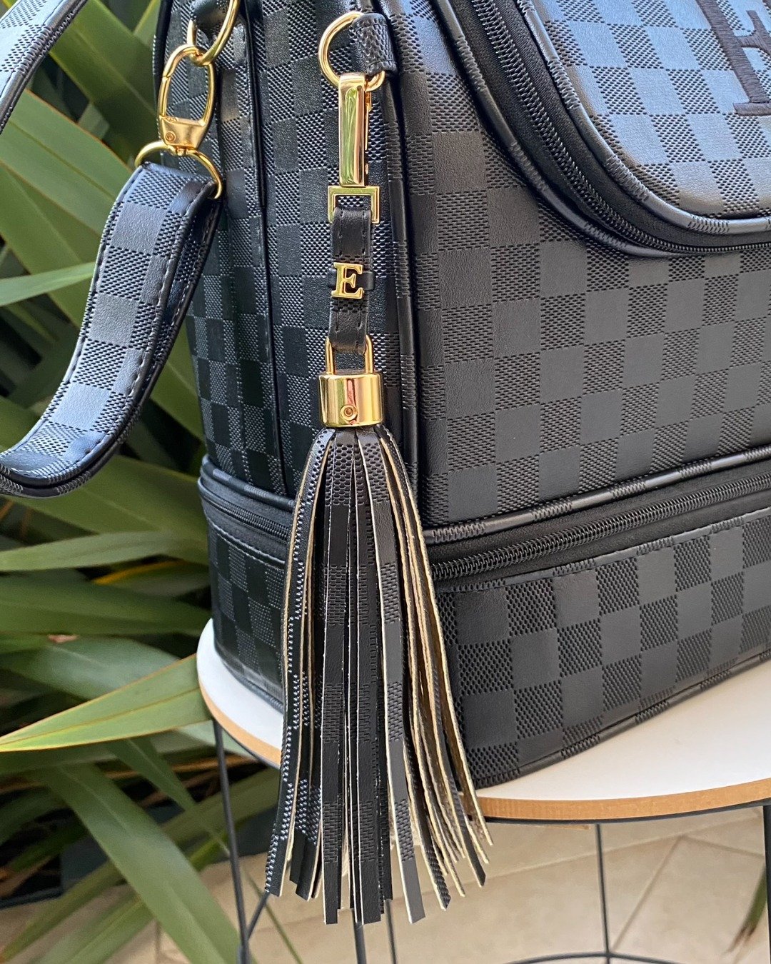 Chaveiro Tassel – Sintético preto inspiração LV com inicial em metal