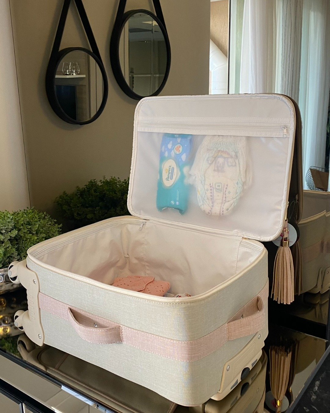 A Mala de rodinhas 360° é a praticidade em forma de mala! É o tamanho perfeito para entrar no avião com você, sem precisar despachar! Contém alça de mão e 4 rodinhas 360º + 1 rodinha extensível! Ela tem um bolso frontal de zíper e no compartimento principal tem 2 elásticos para prender as roupinhas, mantas, etc, e mais um bolso de zíper plástico para separar mais itens!