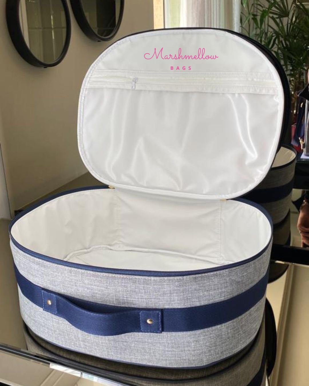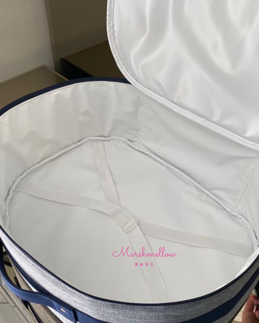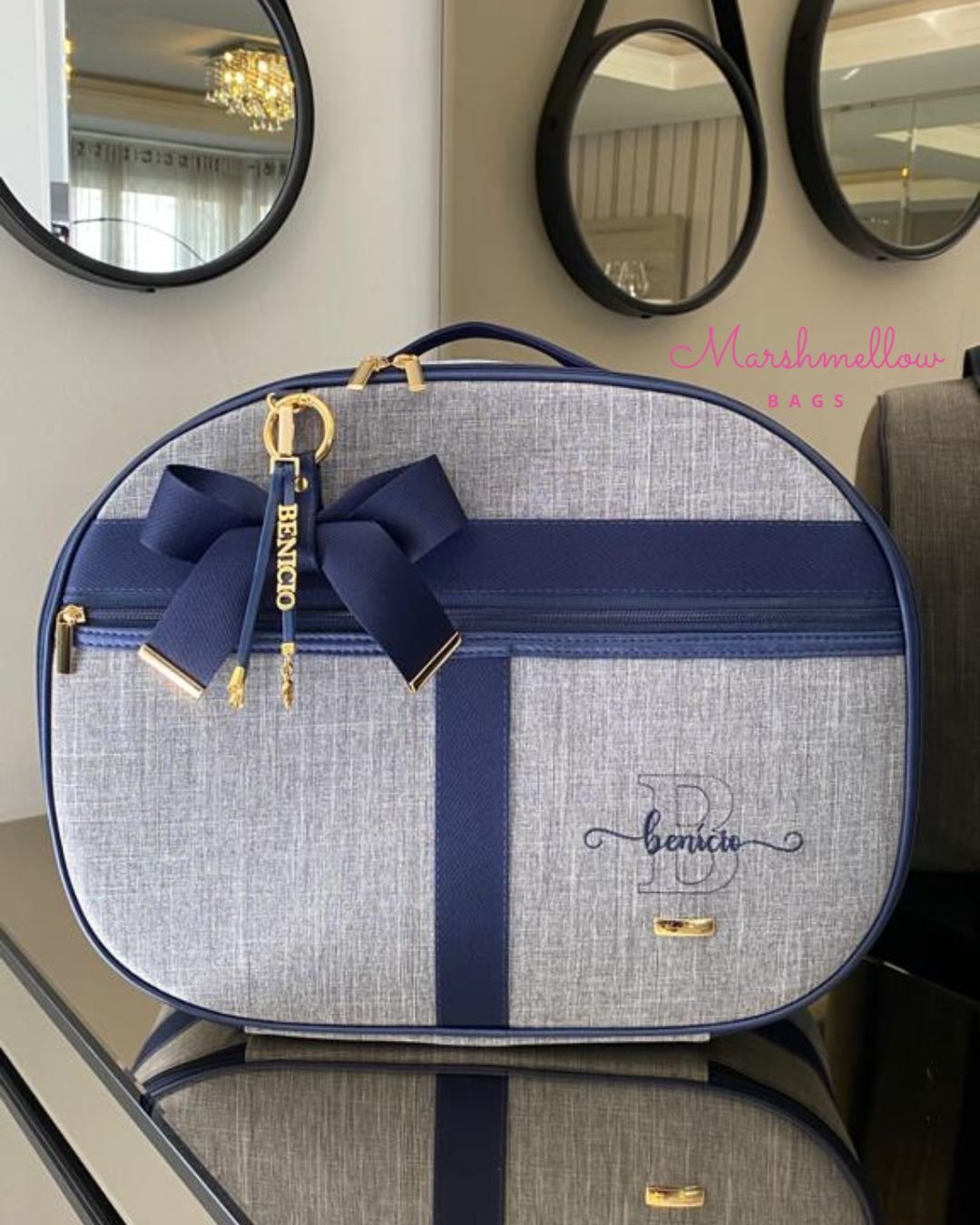 Mala Maternidade Clássica – Linho cinza com detalhes em sintético e fitas azul marinho