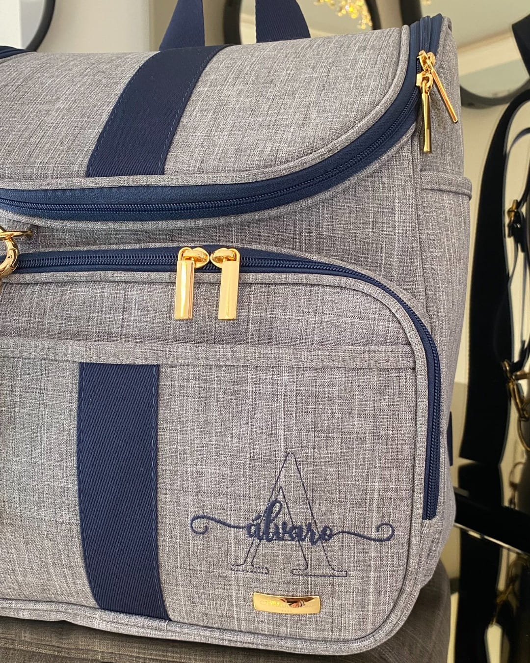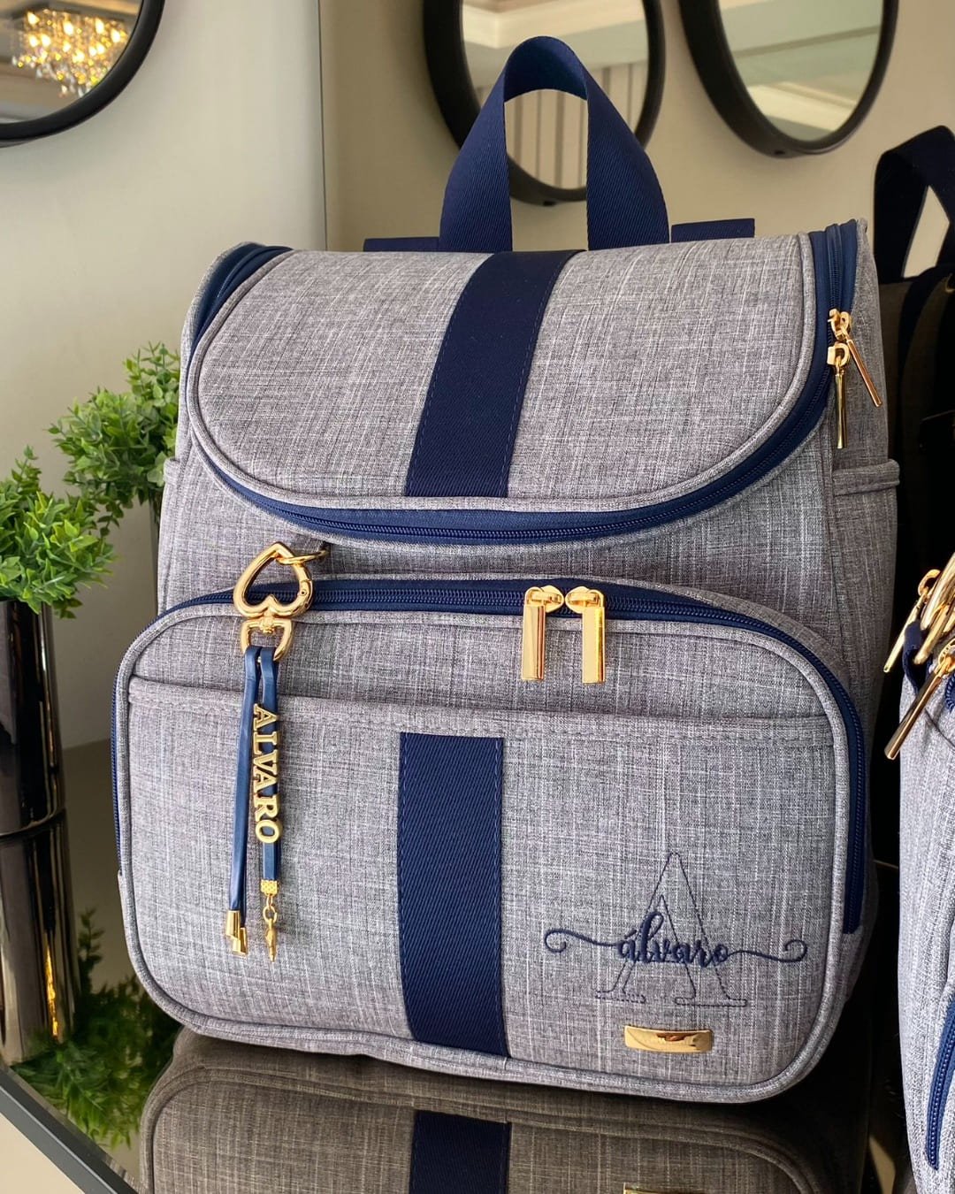 Mochila 2 em 1 – Linho cinza com fita e bordado em azul marinho