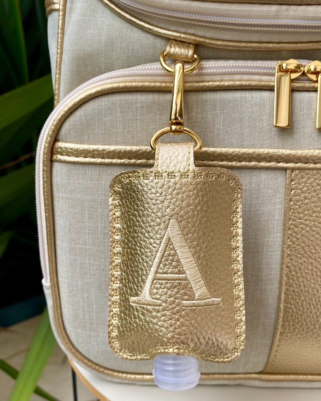 Porta Álcool em Gel – Sintético dourado com bordado bege claro