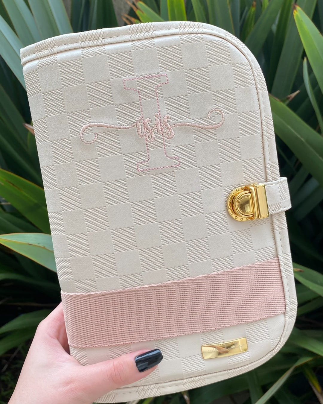 Porta Caderneta de Vacinação – Sintético Marfim LV com fita e bordado em rosê