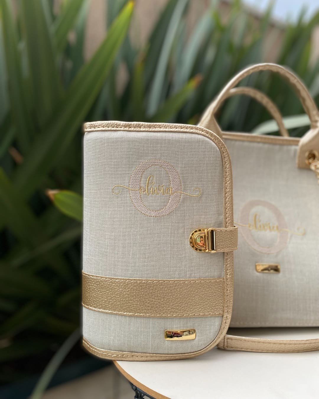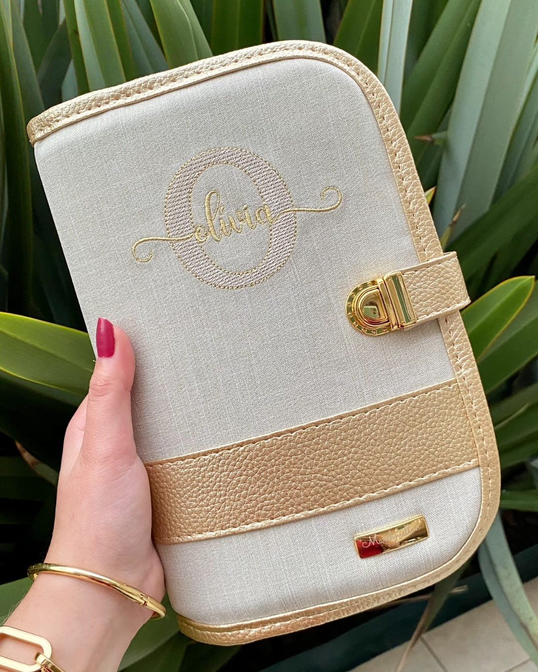Porta Caderneta de Vacinação – Linho bege cru com detalhes em dourado