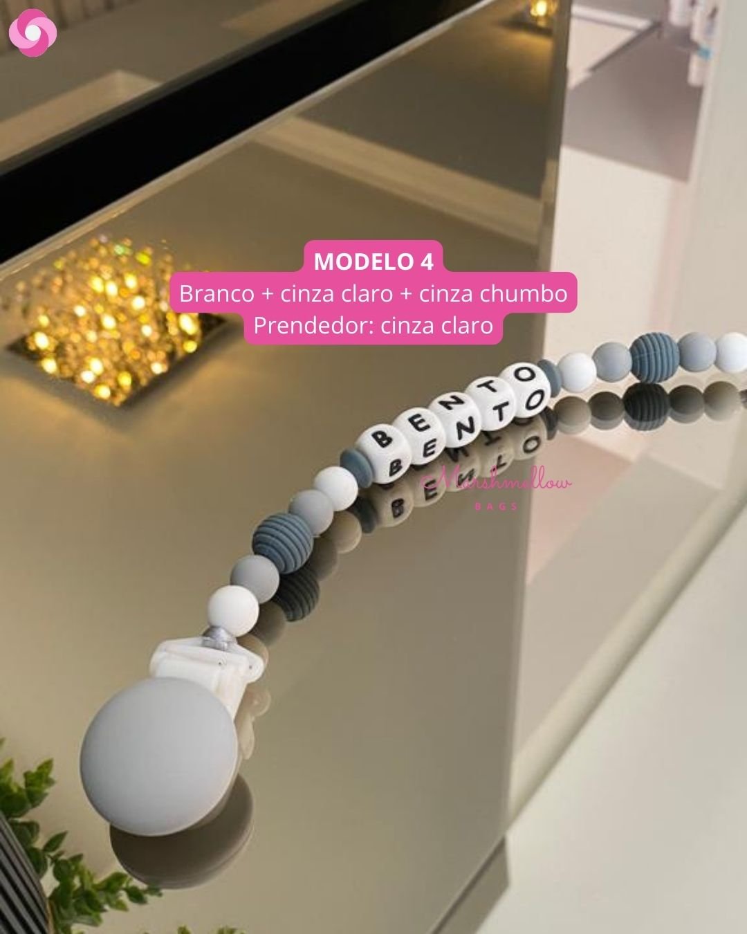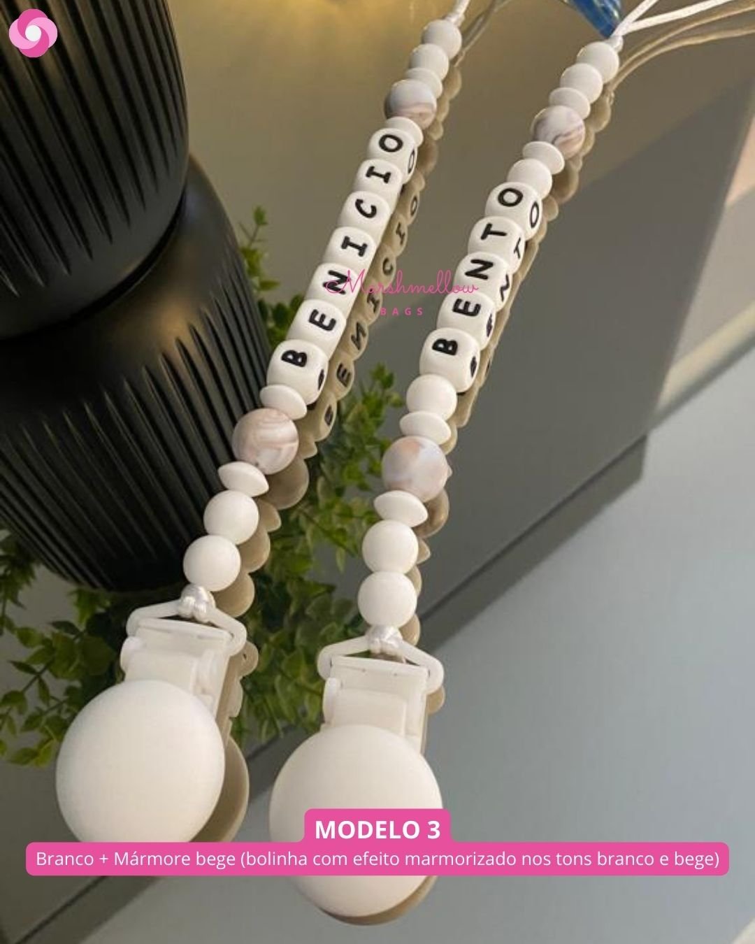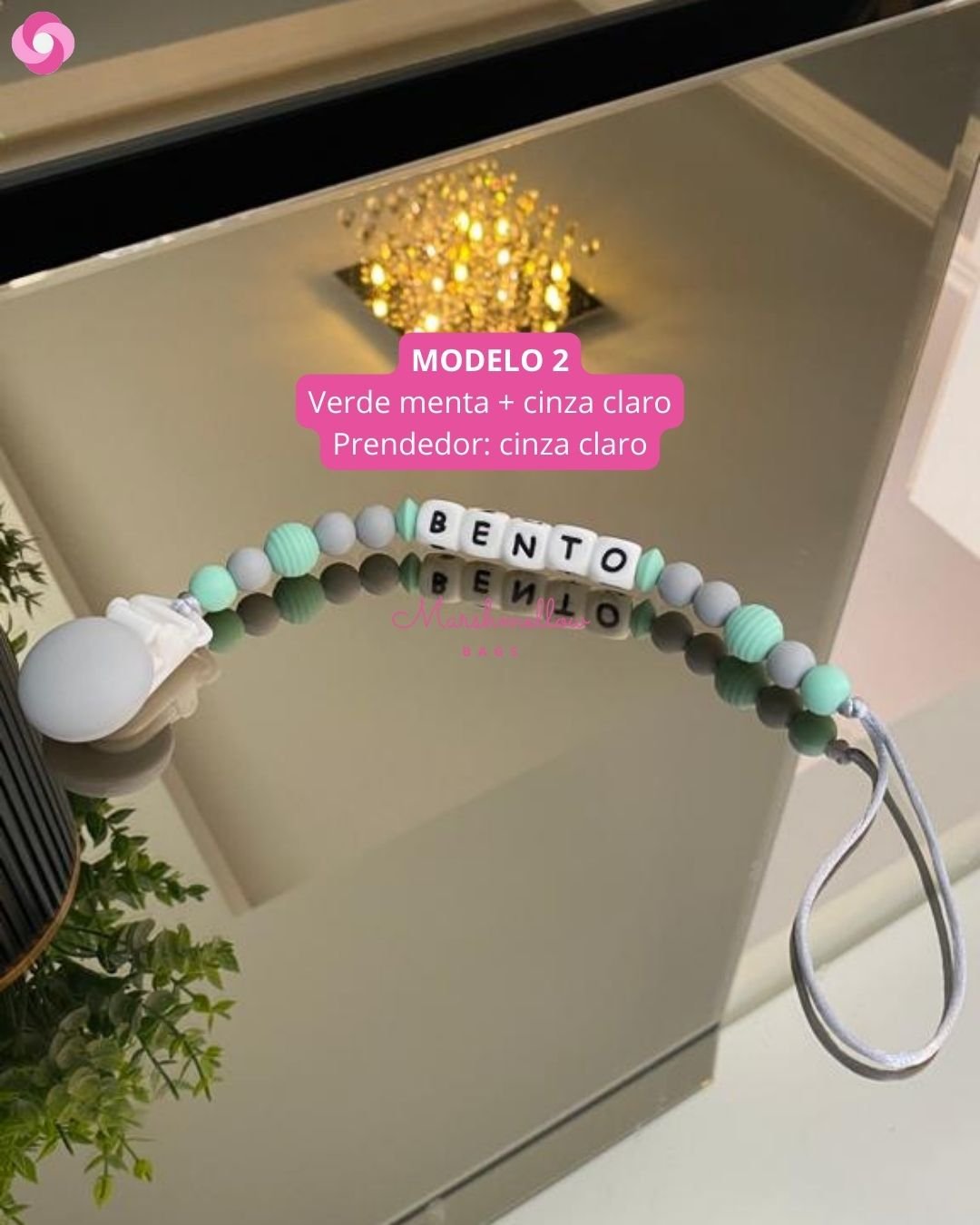 O nosso prendedor personalizado é feito de bolinhas e letras 100% silicone de grau alimentício, BPA free, sem metais, super seguro e semi macio, virando um mordedor para o bebê, principalmente na fase em que está crescendo os dentinhos; é perfeito!