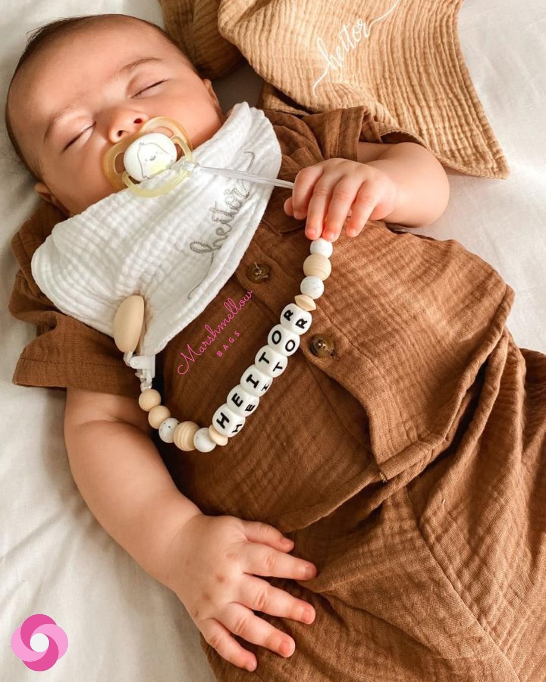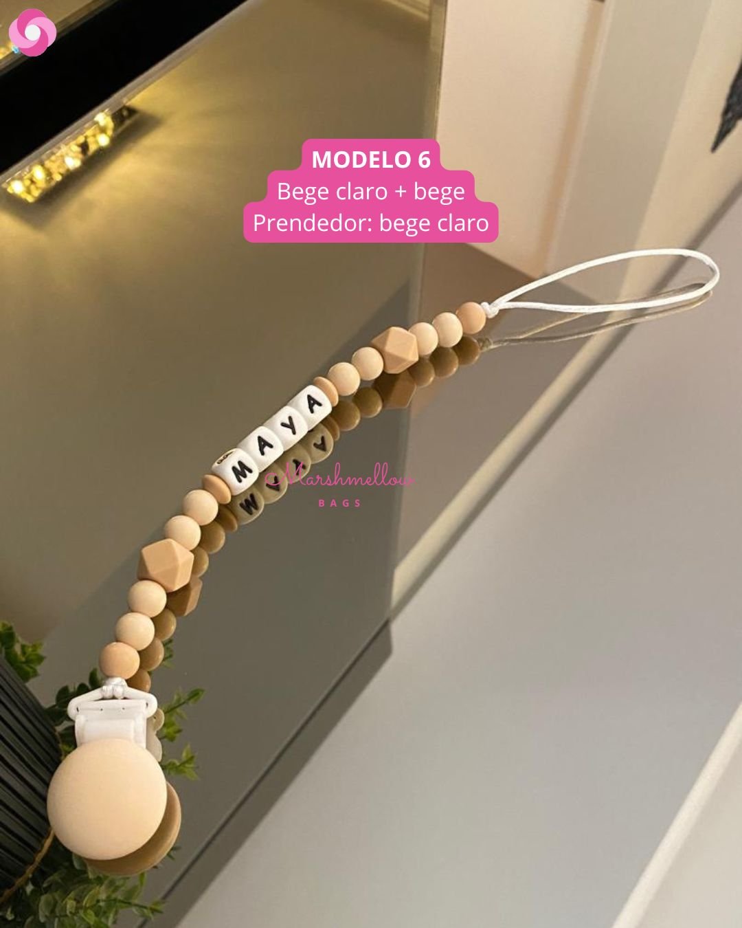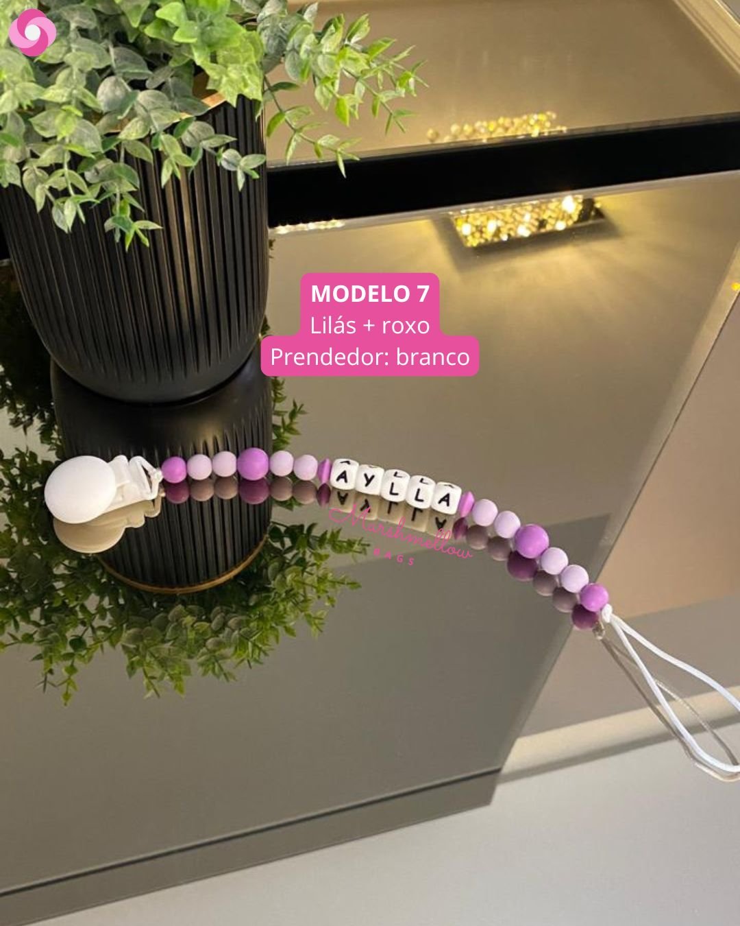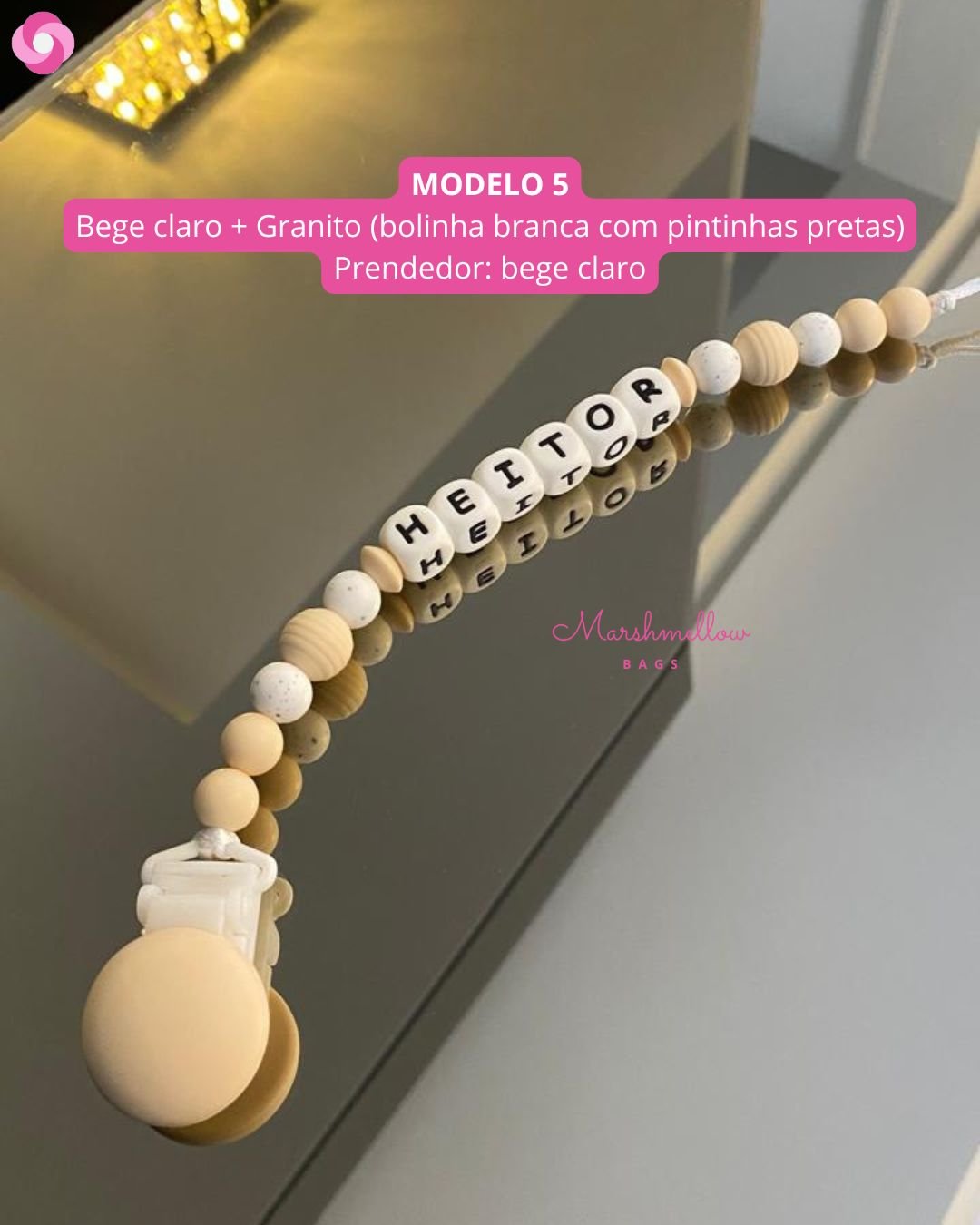 O nosso prendedor personalizado é feito de bolinhas e letras 100% silicone de grau alimentício, BPA free, sem metais, super seguro e semi macio, virando um mordedor para o bebê, principalmente na fase em que está crescendo os dentinhos; é perfeito!