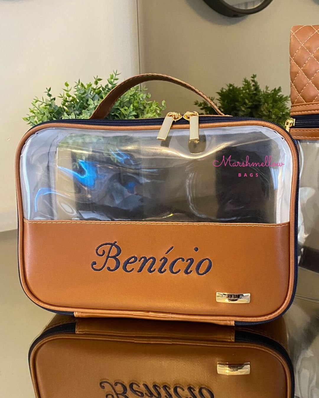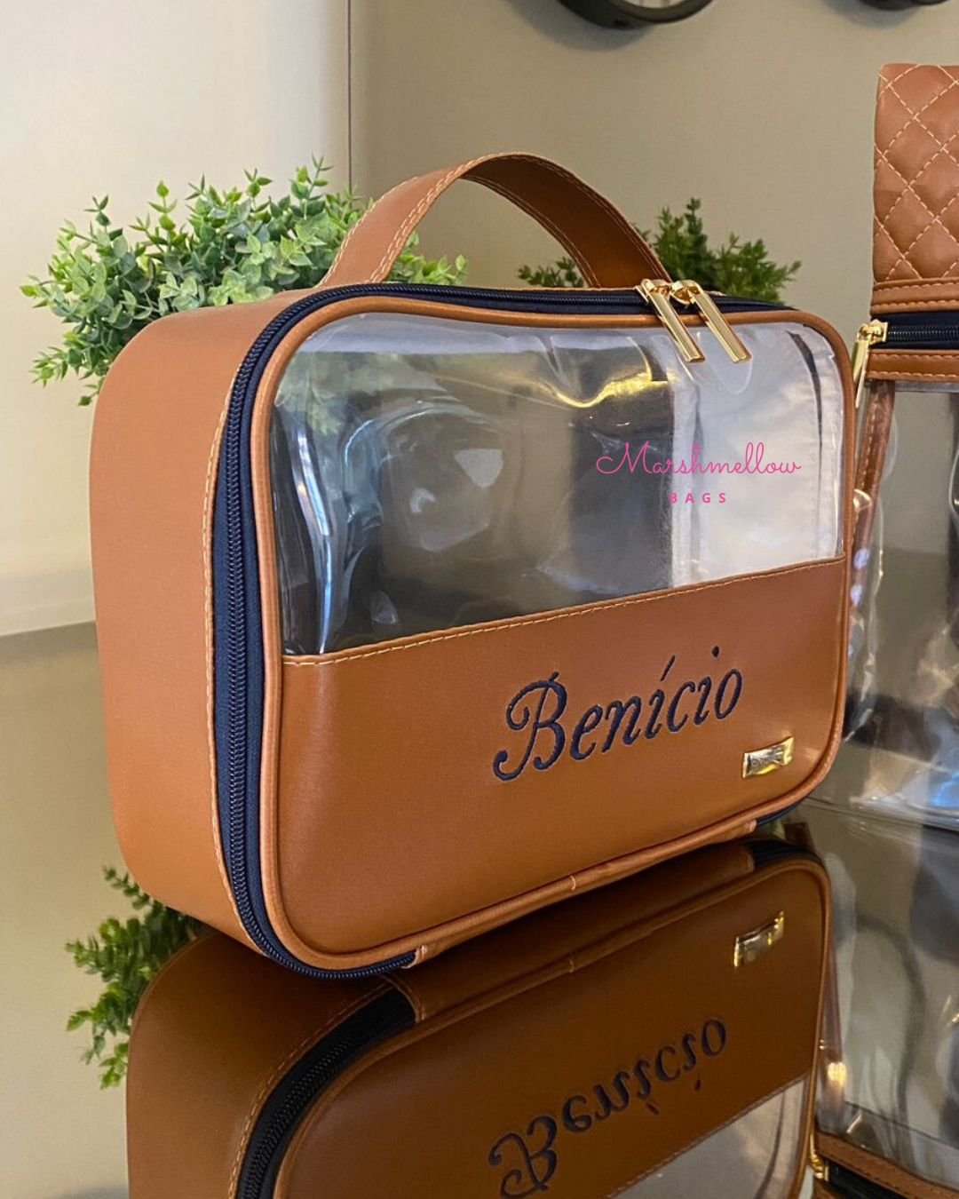 Sweet P – Sintético caramelo + bordado e zíper em azul marinho